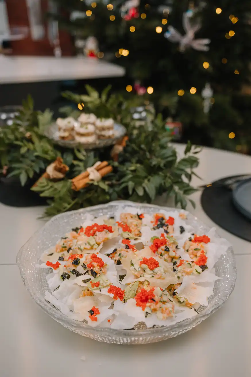 Puode įkaitinkite aliejų. Įdėkite ryžių popieriaus lakštus po vieną ir leiskite jiems akimirksniu išsipūsti. Tuomet išimkite iš aliejaus ir nusausinkite. Atvėsusius paplotėlius sulaužykite į mažesnius gabalėlius. Lašišą supjaustykite mažais kubeliais ir sumaišykite su majonezu, sriracha padažu, sojų padažu, sezamų aliejumi ir juodomis sezamų sėklomis. Avokadą susmulkinkite, agurką supjaustykite mažais kubeliais, svogūnų laiškus supjaustykite plonais griežinėliais. Traškius ryžių paplotėlių gabalėlius sudėkite į lėkštę, ant jų dėkite lašišos mišinio, apibarstykite avokadu, agurku, svogūnų laiškais ir nori trupiniais. Ant viršaus pabarstykite smulkiais ikrais. Patiekite su laimo skiltelėmis. Valgykite iš karto, kol paplotėliai traškūs.